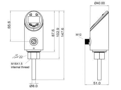 The housing is made of stainless steel, ensuring high durability and suitability for harsh industrial environments. An M12 A-code 4-pin connector is used for quick and reliable installation. All parameters can be easily set via the on-board buttons or IO-Link, and the key lock function effectively prevents accidental operation.