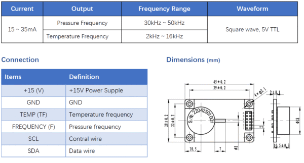 The sensor’s pressure chip employs a tuning fork beam design for its resonant structure, operating via in-plane vibration. Resonant frequency is captured through electrostatic excitation and capacitance detection, then converted into a frequency signal output via a closed-loop control circuit.