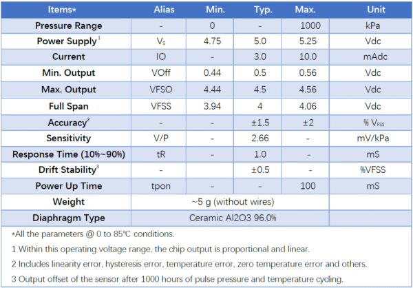 The Wheatstone bridge is oriented internally and has an internal cavity. Signal conditioning electronics are integrated on the back circuit board to produce a 0.5~4.5V ratio metric output, temperature compensation and calibration of the sensor. Due to the excellent chemical resistance of the Al2O3 ceramics, the GP310 sensor is suitable for use in almost all corrosive media.