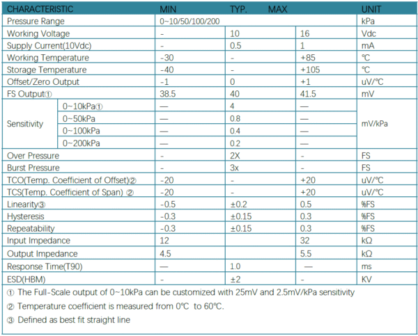 The sensor’s zero output, full-scale output, temperature drift and other parameters have been calibrated and compensated by laser trimming. The sensor generates a high-precision standard voltage output signal proportional to the supply voltage.