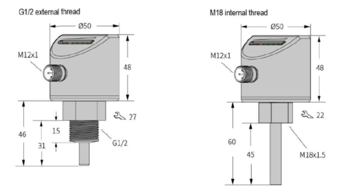Kalorimetrisches Messprinzip Durchfluss- und Temperaturalarm Digitale LED-Anzeige mit Spiegelung Programmierung über 3 Tasten 360° drehbares Gehäuse M18 × 1,5 Innengewinde PNP-Schaltausgang (NO) M12-Steckverbinder